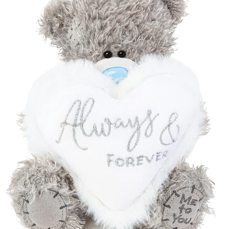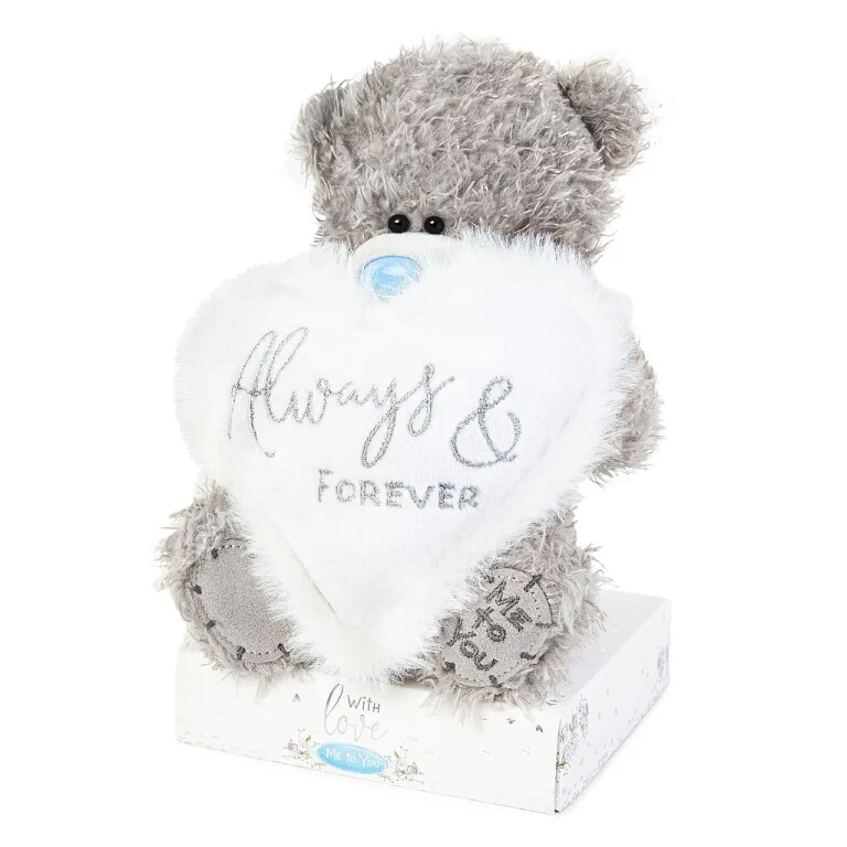 This adorable Tatty Teddy is holding a soft, fluffy white love heart with ‘Always and Forever’ embroidered in silver across the front.