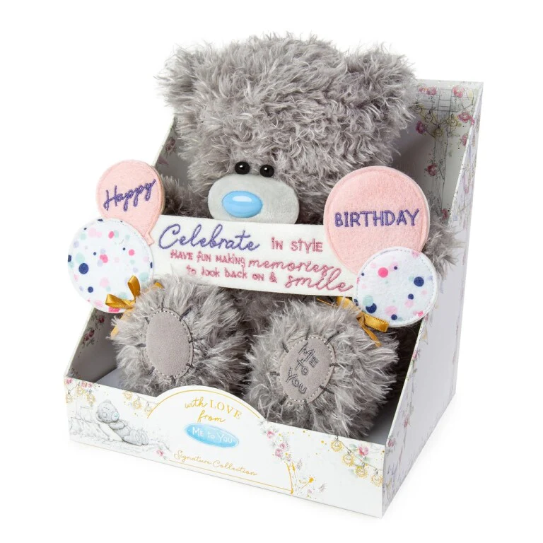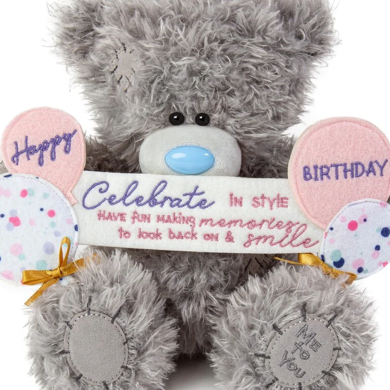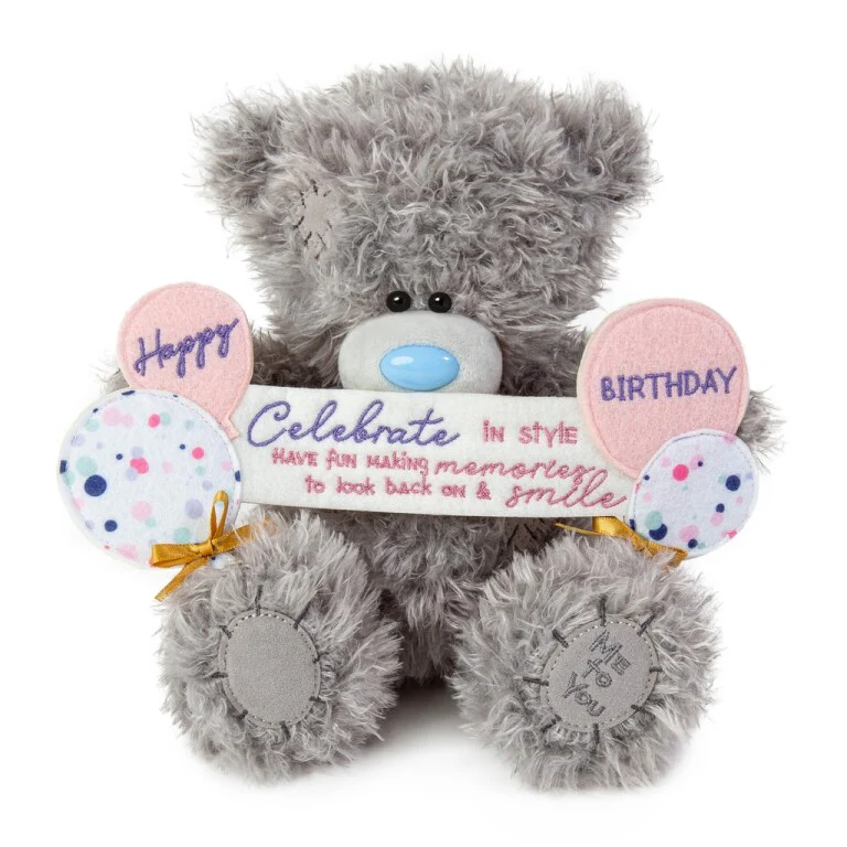 Tatty Teddy is holding a colourful display of birthday balloons and a banner embroidered with the words ‘Celebrate in style, have fun making memories to look back on and smile’. Perfect as a gift for a friend, family member or special work colleague, this bear is ideal for a child’s birthday or a grown-up Tatty Teddy fan.