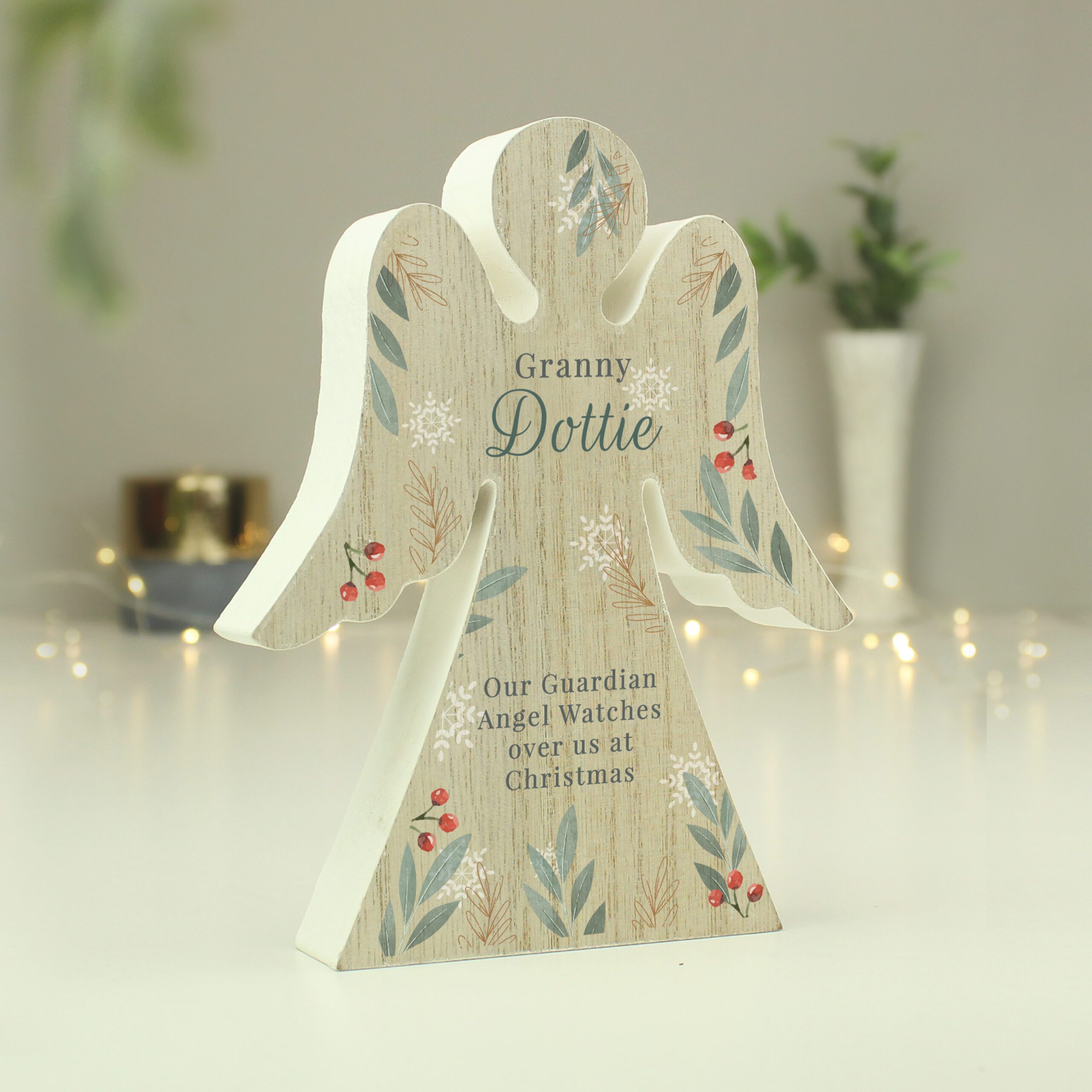 Add a touch of elegance and heartfelt sentiment to your Christmas decor with our exquisite Personalised Christmas Foliage Wooden Angel Ornament.