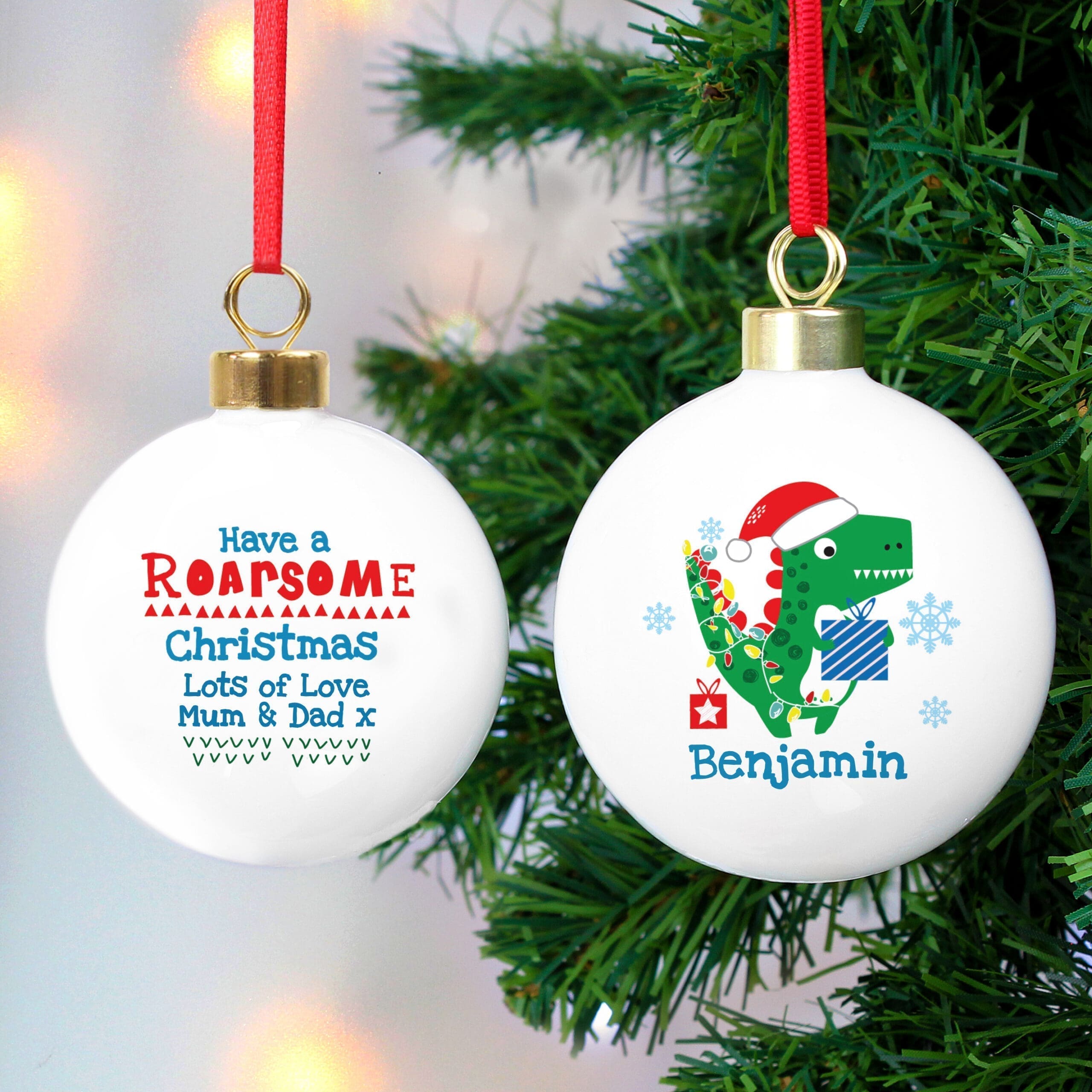 This customisable Christmas bauble adds a personal touch to your tree, featuring a name on the front and two lines of text on the back. Get ready for a roarsome Christmas with this unique decoration!